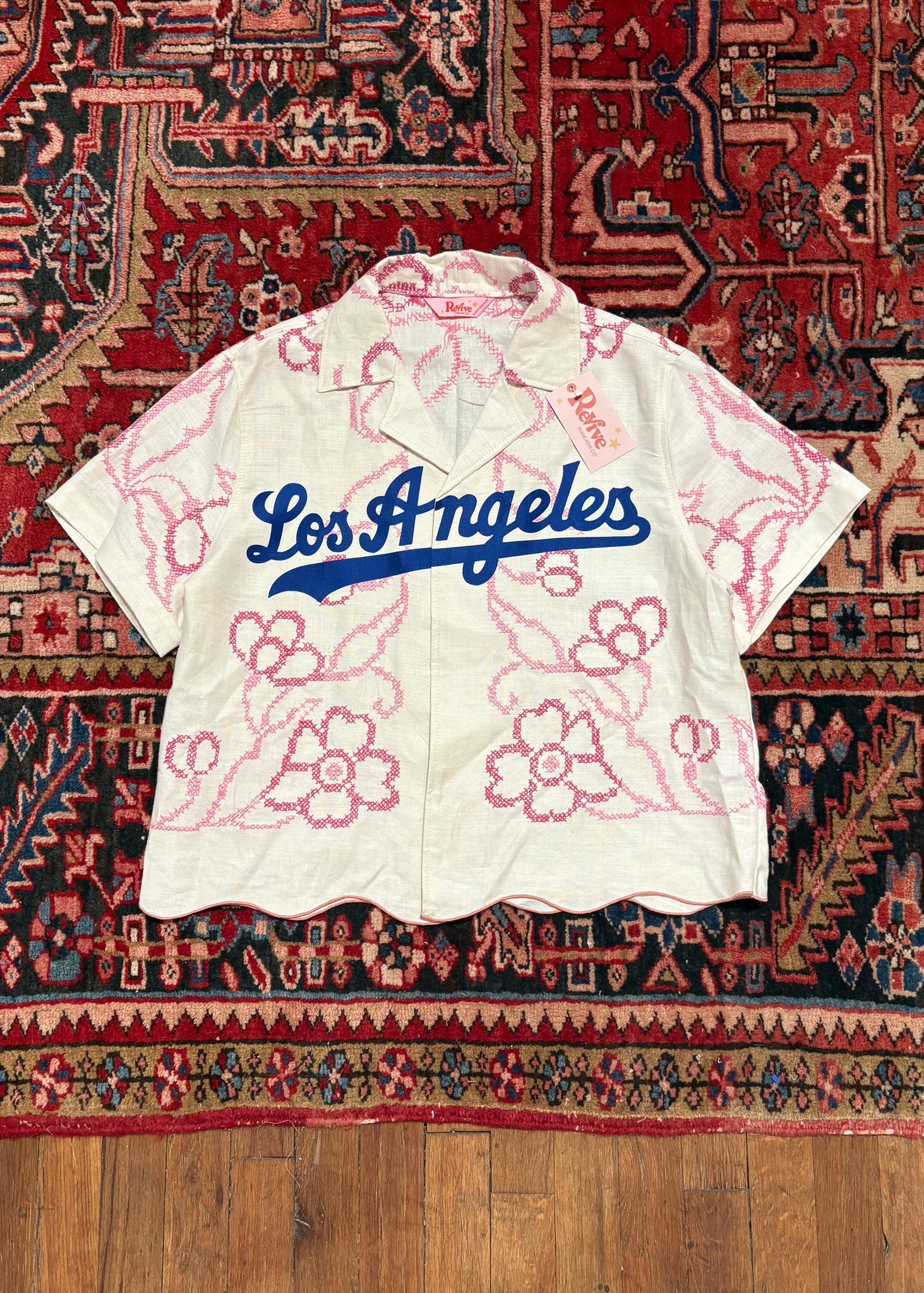 Los Angeles Jersey made from a recycled tablecloth and baseball jersey.